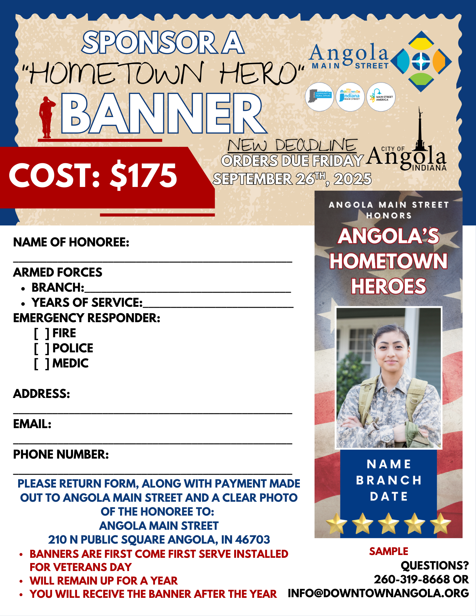 Angola Main Street is proud to kick off the 3rd Annual Hometown Hero Banner Program! Honor your loved ones and community heroes by submitting an application to have their names and faces displayed proudly in our downtown area.